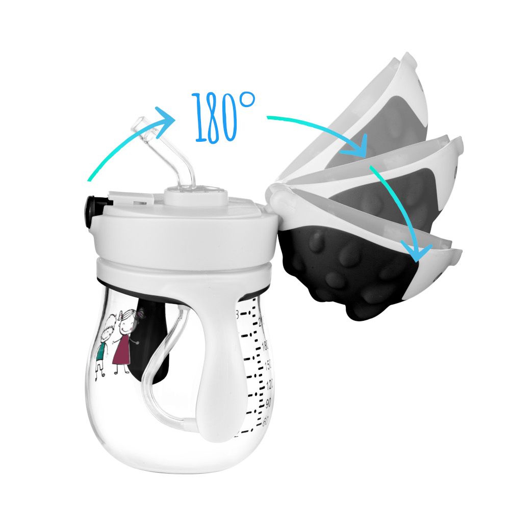 AKUKU A0034 Bidon ze słomką z odważnikiem Szary to praktyczne rozwiązanie dla dzieci, umożliwiające picie pod każdym kątem dzięki silikonowej słomce z odważnikiem. Wykonany z trwałego tworzywa Tritan, całkowicie wolnego od BPA, łączy odporność na uszkodzenia i przebarwienia z wyglądem przypominającym szkło. Bidon jest szczelny, łatwy w użyciu dzięki otwieraniu jednym przyciskiem, a jego przezroczysta konstrukcja z podziałką pozwala kontrolować ilość płynu. Idealny w domu i w podróży, pojemność 250 ml. Tritan nie zmienia smaku ani zapachu przechowywanych napojów, nie wydziela szkodliwych substancji i utrzymuje świeżość napojów, nie wchłaniając ich aromatów. Kubek można myć w zmywarce na górnej półce (bez słomki).