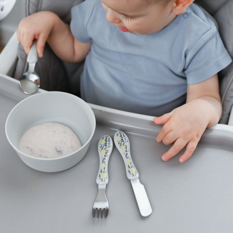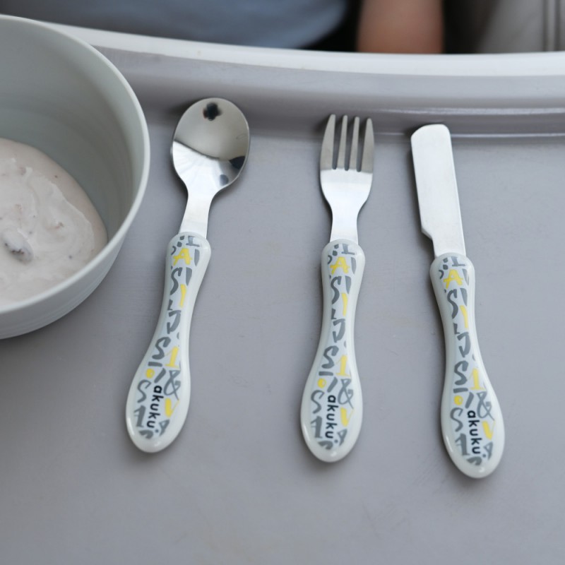 AKUKU A0103 to zestaw metalowych sztućców dla dzieci, zaprojektowany z myślą o bezpiecznej i komfortowej nauce samodzielnego jedzenia. W komplecie znajduje się widelec, łyżka oraz nóż, wykonane z wysokiej jakości stali nierdzewnej, odpornej na uszkodzenia i przeznaczonej do kontaktu z żywnością. Odpowiednio dobrany rozmiar sztućców sprawia, że idealnie pasują do małej dłoni i buzi dziecka, ułatwiając chwytanie i kontrolowanie ruchów podczas posiłków. Zestaw polecany jest dla dzieci od 9. miesiąca życia i doskonale sprawdzi się na etapie rozszerzania diety oraz nauki samodzielności przy stole.