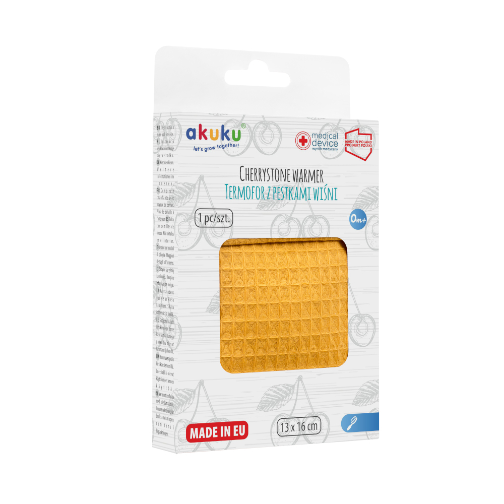 Termofor AKUKU A0636 z pestkami wiśni o wymiarach 13×16 cm w kolorze żółtym jest wyrobem medycznym wykonanym z odpowiednio dobranych i osuszonych pestek wiśni. Jest w pełni bezpieczny i przyjazny dla dziecka, nie zawiera płynów, które mogłyby się rozlać, a po podgrzaniu utrzymuje ciepło do 1 godziny, naturalnie oddając je bez ryzyka poparzenia. Kształt termoforu jest idealny na małe brzuszki. Można go stosować na gorąco przy kolkach noworodkowych, wzdęciach, bólach mięśni, rwie kulszowej i bólach menstruacyjnych, a na zimno przy ugryzieniach owadów, gorączce, siniakach, guzach i migrenach. Podgrzewa się go bez pokrowca w kuchence mikrofalowej (600 W, około 90 sekund), piekarniku (130°C, około 10 minut) lub na innym źródle ciepła, po czym należy wymieszać pestki i sprawdzić temperaturę. Pokrowiec można prać ręcznie lub w pralce w temperaturze 30°C. Produkt nie jest zabawką i zawiera małe elementy, dlatego należy go przechowywać poza zasięgiem dzieci. Przed każdym użyciem należy sprawdzić stan wkładu i w razie zużycia wymienić go na nowy.