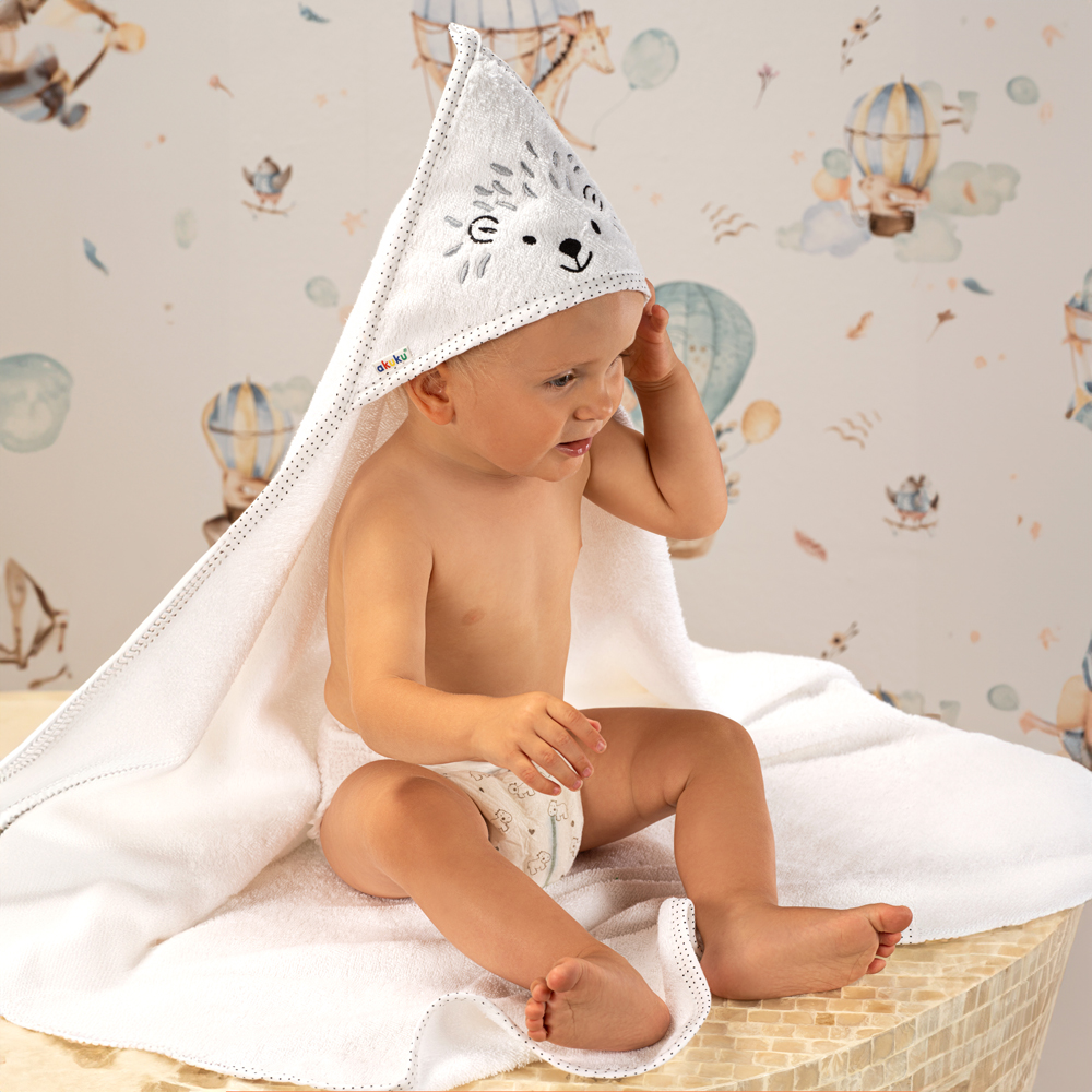 Ręcznik kąpielowy Akuku A0661 z kapturkiem w kolorze białym w rozmiarze 100×100 cm wykonany jest z puszystej bawełny frotte. Doskonale wchłania wilgoć i chroni dziecko przed wychłodzeniem. Jest miękki i delikatny, nie podrażnia skóry, a luźny fason nie ogranicza ruchów dziecka. Wszyty kapturek chroni mokrą głowę. Nadaje się zarówno dla noworodków, jak i starszych dzieci. Produkt należy przechowywać w miejscu niedostępnym dla dziecka, sposób prania znajduje się na wszywce. Skład 100% bawełna, przeznaczony dla dzieci 0m+.
