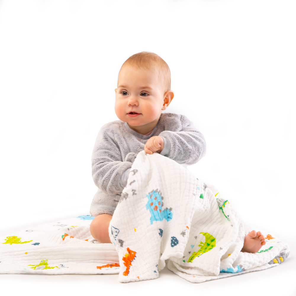 Kocyk muślinowy Akuku A0685 w rozmiarze 110×105 cm w wzór Dinozaury wykonany jest z sześciowarstwowej tetry z 100% bawełny. Jest lekki, przewiewny i miękki, delikatny dla wrażliwej skóry dziecka, nie powoduje alergii ani podrażnień. Może pełnić funkcję otulacza po kąpieli, kocyka do spania, na spacerze lub w podróży. Wysoka chłonność utrzymuje skórę maluszka suchą. Produkt można prać w pralce w temperaturze do 40°C lub ręcznie, z podobnymi kolorami, używając delikatnych środków piorących bez wybielaczy i chloru. Kurczliwość po praniu wynosi około 5%. Przed pierwszym użyciem zaleca się pranie wstępne. Produkt należy regularnie kontrolować pod kątem zużycia i wyrzucić w razie uszkodzenia.