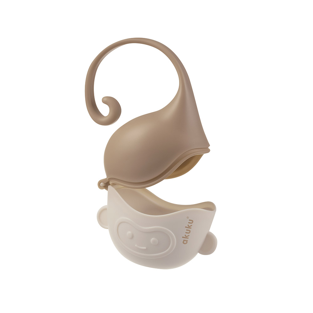 AKUKU A0688 to pojemnik na smoczek w kształcie małpki, przydatny podczas podróży i spacerów, który chroni smoczki przed zabrudzeniem i uszkodzeniem. Pojemnik pomieści nawet dwa smoczki i można go łatwo zamocować do wózka, fotelika, torby lub poręczy łóżeczka. Ma neutralną kolorystykę pasującą do każdego wózka i torby. Wykonany jest z bezpiecznych materiałów, nie zawiera BPA. Produkt należy utrzymywać w czystości, myjąc go w ciepłej wodzie z delikatnym środkiem myjącym i okresowo polewając wrzątkiem; nie wolno gotować ani sterylizować. Wymiary pojemnika to 13 x 8,5 x 5,5 cm. Produkt nie jest zabawką i należy używać go pod nadzorem osoby dorosłej, wyrzucając w przypadku oznak zużycia.