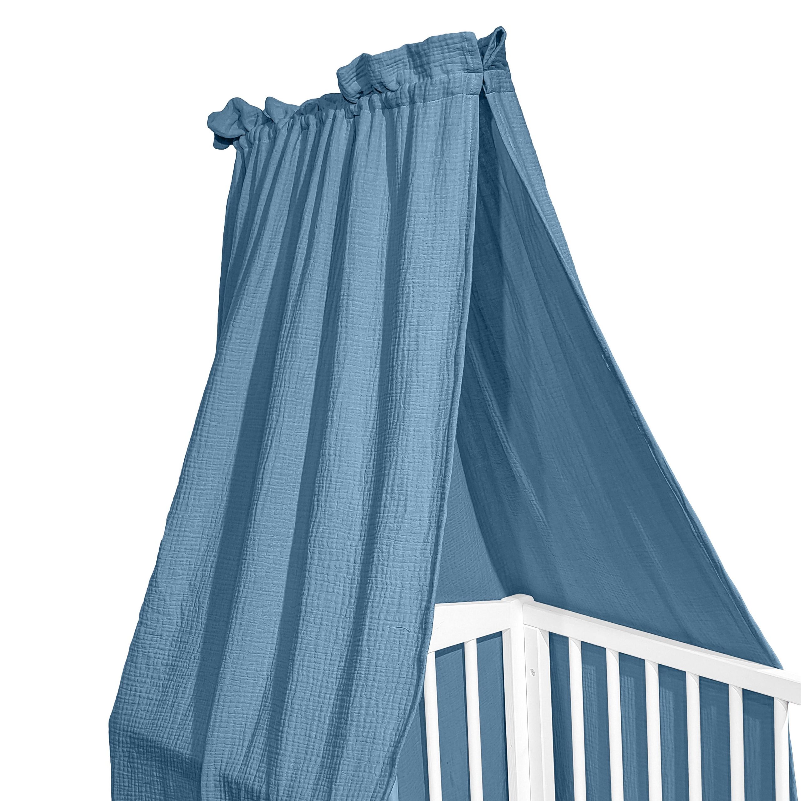 Albero Mio Baldachim Cotton Color CC7 w kolorze niebieskim to elegancki i praktyczny dodatek do pokoju dziecka, który tworzy przytulną i spokojną przestrzeń do snu oraz zabawy. Wykonany z lekkiego i przewiewnego muślinu bawełnianego (double gauze), jest miękki, delikatny w dotyku, a jednocześnie wytrzymały i łatwy w utrzymaniu czystości.