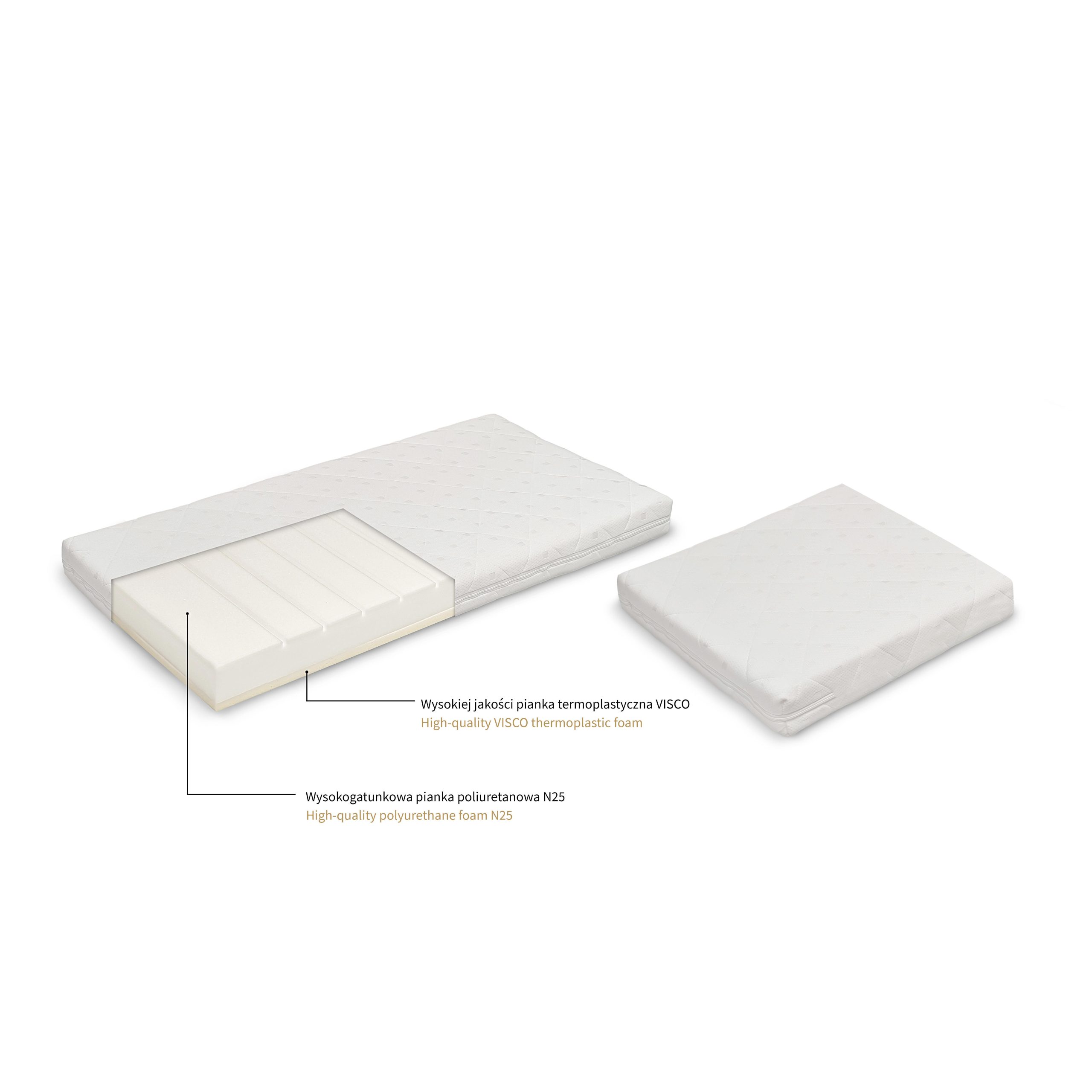 Materac LUX Kompakt składa się z dwóch części o wymiarach 120x80x9 cm i 82x50x9 cm. Wypełnienie tworzą pianka visco (termoelastyczna), dopasowująca się do kształtu ciała dziecka, oraz pianka poliuretanowa N25. Pokrowiec jest pikowany, wykonany w 100% z poliestru i zamykany na zamek, co ułatwia jego zdejmowanie i utrzymanie w czystości.
