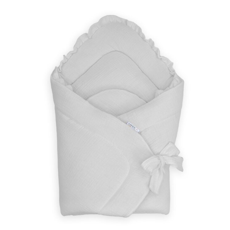ALBERO MIO Rożek niemowlęcy Cotton color CC3 popiel jest wykonany z miękkiego i delikatnego muślinu bawełnianego double gaze, składającego się z dwóch połączonych warstw tkaniny, co nadaje mu lekką i oddychającą strukturę. Rożek jest przyjemny w dotyku, bezpieczny dla skóry dziecka i posiada wszyte antyalergiczne wypełnienie z włókniny silikonowej, które izoluje ciepło i przepuszcza powietrze. Nie posiada dodatkowego usztywnienia, dzięki czemu pozwala na utrzymanie naturalnej i wygodnej pozycji noworodka. Wiązany na kokardę, umożliwia dopasowanie rozmiaru do potrzeb dziecka. Dodatkową ozdobą jest falbanka, która nadaje rożkowi elegancji. Może być używany jako kocyk, ochraniacz na łóżeczko, otulacz lub podkładka pielęgnacyjna. Rożek ma wymiary 75×75 cm, jest wyprodukowany w Polsce z materiałów posiadających certyfikat Oeko-Tex.