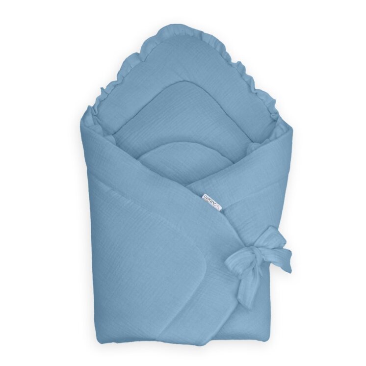 ALBERO MIO Rożek niemowlęcy Cotton color CC7 niebieski to rożek wykonany z miękkiego i delikatnego muślinu bawełnianego double gaze, składającego się z dwóch połączonych warstw tkaniny, co nadaje mu lekką i oddychającą strukturę. Rożek jest przyjemny w dotyku, bezpieczny dla skóry dziecka i posiada wszyte antyalergiczne wypełnienie z włókniny silikonowej, które izoluje ciepło i przepuszcza powietrze. Nie posiada dodatkowego usztywnienia, co pozwala na utrzymanie naturalnej i wygodnej pozycji noworodka. Wiązany na kokardę, umożliwia dopasowanie rozmiaru do potrzeb dziecka. Dodatkową ozdobą jest falbanka, która nadaje rożkowi elegancji. Może służyć jako kocyk, ochraniacz na łóżeczko, otulacz lub podkładka pielęgnacyjna. Rożek ma wymiary 75×75 cm, jest wyprodukowany w Polsce z materiałów posiadających certyfikat Oeko-Tex.