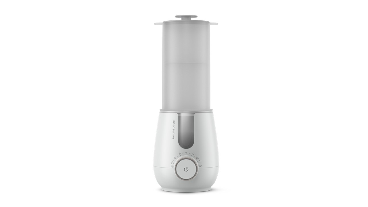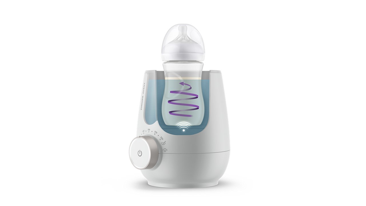 AVENT SCF359/00 to podgrzewacz do butelek i sterylizator 2w1. Urządzenie umożliwia szybkie podgrzewanie butelek w kąpieli wodnej w zaledwie 3 minuty, zachowując składniki odżywcze mleka. Sterylizacja parowa eliminuje 99,9% bakterii w butelkach, smoczkach i małych zabawkach, bez użycia chemikaliów. Stała cyrkulacja mleka zapewnia równomierne podgrzewanie bez gorących punktów. Inteligentny czujnik wykrywa początkową temperaturę mleka i automatycznie dopasowuje czas podgrzewania. Podgrzana butelka utrzymywana jest w odpowiedniej temperaturze do 60 minut. Urządzenie jest proste w obsłudze dzięki jednemu przyciskowi do podgrzewania i sterylizacji oraz wizualnym i dźwiękowym powiadomieniom. Przezroczyste okienko pozwala kontrolować poziom wody przed każdym cyklem. Konstrukcja jest kompaktowa i umożliwia jednoczesną sterylizację butelek, smoczków i małych zabawek. Szeroka szyjka ułatwia czyszczenie, a elementy sterylizacji można myć w zmywarce. Podgrzewacz jest kompatybilny z butelkami i słoikami różnych marek oraz o różnych rozmiarach. Materiał wykonania to plastik PP i ABS, pobór mocy wynosi 400 W, napięcie 220–240 V lub 120–127 V, waga 1000 g, wymiary 260,4 x 150 x 210,5 mm, kraj pochodzenia Chiny. Zestaw zawiera podgrzewacz i sterylizator 2w1. Czas podgrzewania dotyczy 150 ml mleka o temperaturze pokojowej w butelce Avent Natural o pojemności 266 ml.