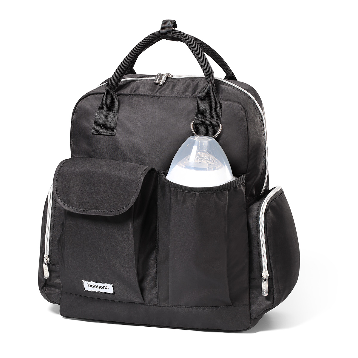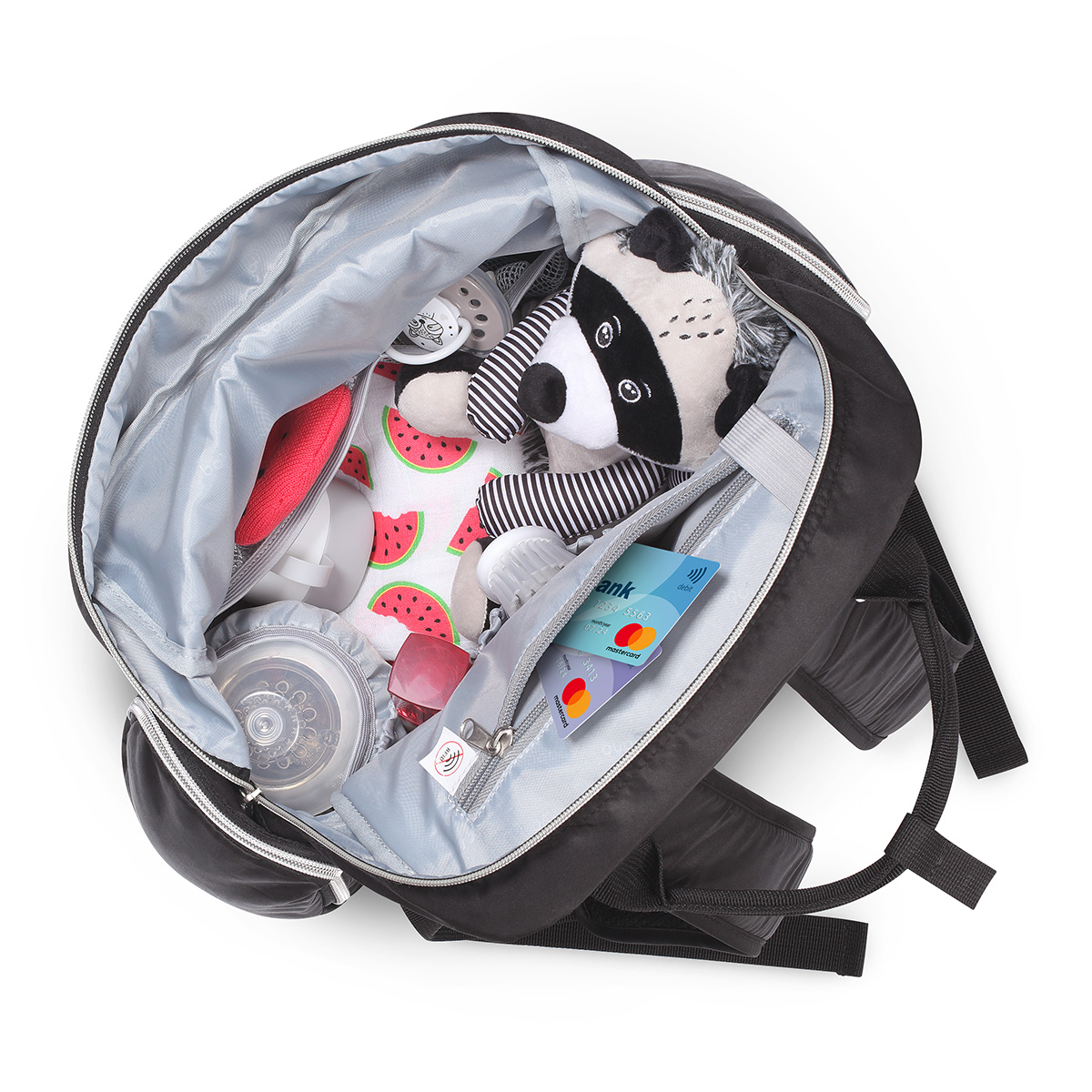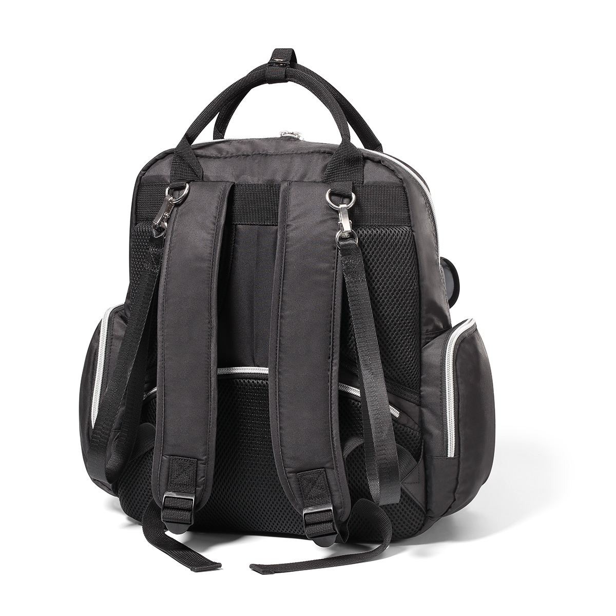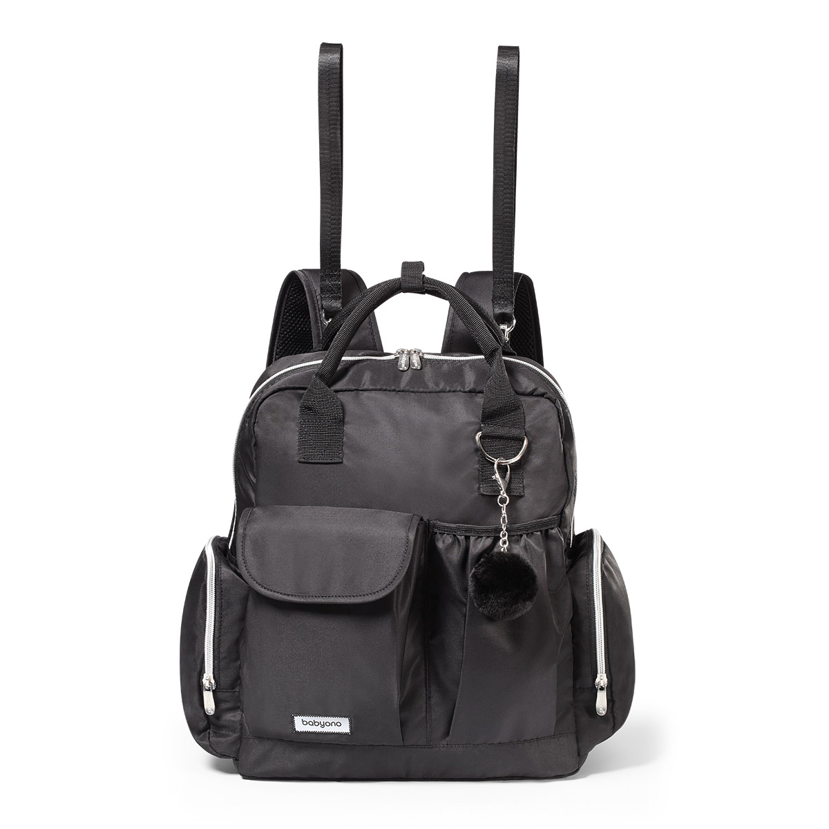 Plecak można nosić na plecach lub przypiąć do wózka dzięki odpinanym bocznym paskom, a miękkie, regulowane szelki i krótkie uchwyty do ręki zapewniają komfort użytkowania. Wykonany z trwałego, łatwego w czyszczeniu poliestru, plecak jest odporny na codzienne użytkowanie. Dodatkowo w zestawie znajduje się mata do przewijania, smycz na klucze oraz modny futerkowy breloczek zdobiący przód plecaka.