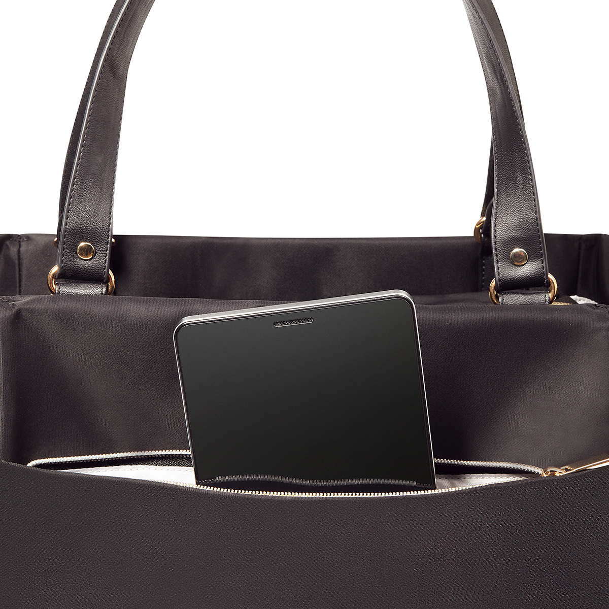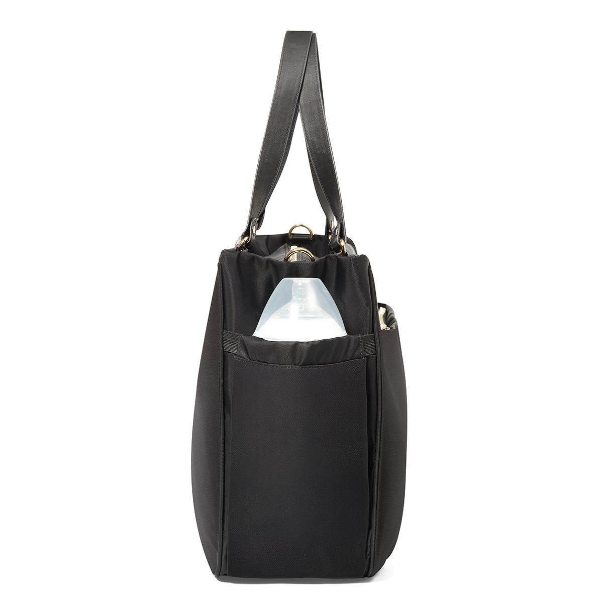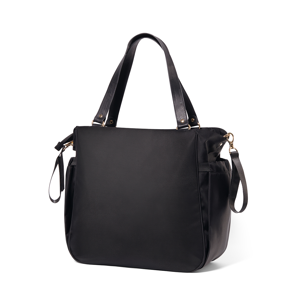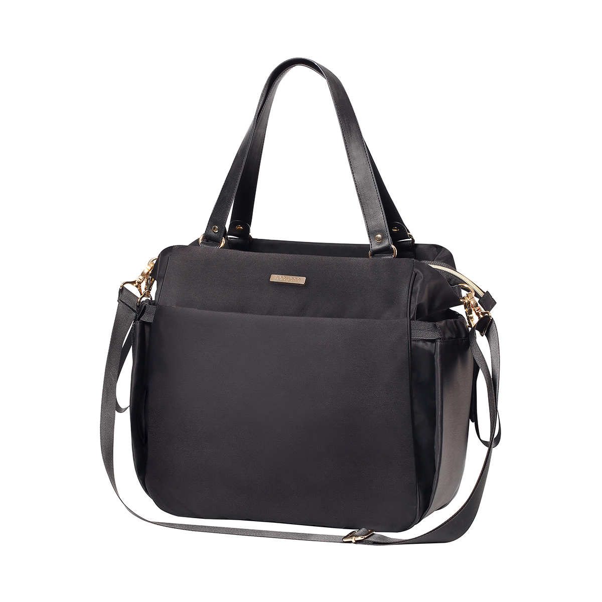 Torba może być noszona na ramieniu lub przypięta do wózka za pomocą odpinanych pasków. Wyposażono ją w smycz na klucze, matę do przewijania i wygodne uchwyty do ręki. Wykonana z trwałego, łatwego w czyszczeniu nylonu, odporny na różne warunki pogodowe. Główna komora zapinana jest na zamek, a solidna konstrukcja gwarantuje trwałość i komfort użytkowania.