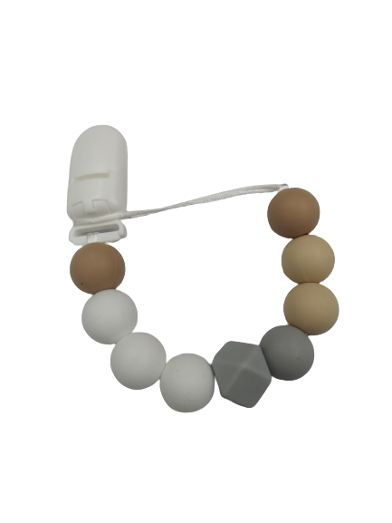 BABY 01435 to ekologiczna zawieszka do smoczka i gryzaczka w kolorze Grey/Sand, wykonana z bezpiecznego silikonu spożywczego, wolnego od BPA, kadmu i ftalanów, z naturalnymi właściwościami antybakteryjnymi. Zawieszka stymuluje rozwój zmysłu dotyku i smaku u niemowląt dzięki zróżnicowanemu kształtowi i materiałom. Można ją schłodzić w lodówce, aby zapewnić chłodny masaż dziąseł podczas ząbkowania. Chroni smoczek przed upadkiem i zabrudzeniem. Należy używać jej pod nadzorem osoby dorosłej, nie stosować podczas snu dziecka i wymieniać co 3 miesiące. Produkt nie jest zabawką; mycie pod bieżącą wodą.