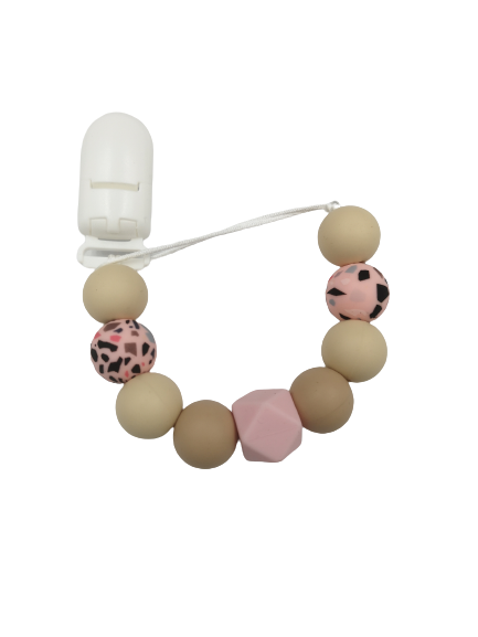 BABY 01438 to ekologiczna zawieszka do smoczka i gryzaczka w kolorze Pink/Sand, wykonana z bezpiecznego silikonu spożywczego, wolnego od BPA, kadmu i ftalanów, z naturalnymi właściwościami antybakteryjnymi. Dzięki różnym kształtom i materiałom stymuluje rozwój zmysłu dotyku i smaku u niemowląt. Można ją schłodzić w lodówce, aby zapewnić chłodny masaż dziąseł podczas ząbkowania. Chroni smoczek przed upadkiem i zabrudzeniem. Należy używać jej pod nadzorem osoby dorosłej, nie stosować podczas snu dziecka i wymieniać co 3 miesiące. Produkt nie jest zabawką; mycie pod bieżącą wodą.