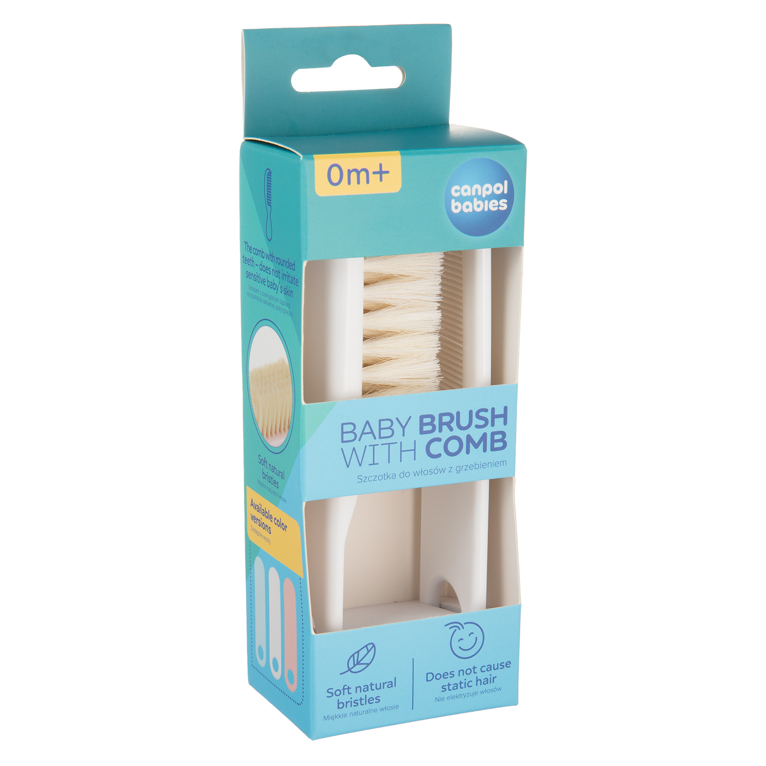 Szczotka i grzebień CANPOL 2/424 w kolorze białym to zestaw do codziennej pielęgnacji włosów dziecka. Szczotka wykonana jest z naturalnego, miękkiego włosia, a grzebień ma zaokrąglone ząbki, które nie podrażniają wrażliwej skóry malucha. Szczotka delikatnie masuje główkę dziecka, nie elektryzując włosów. Produkt nie zawiera BPA i jest odpowiedni dla dzieci od pierwszych dni życia.