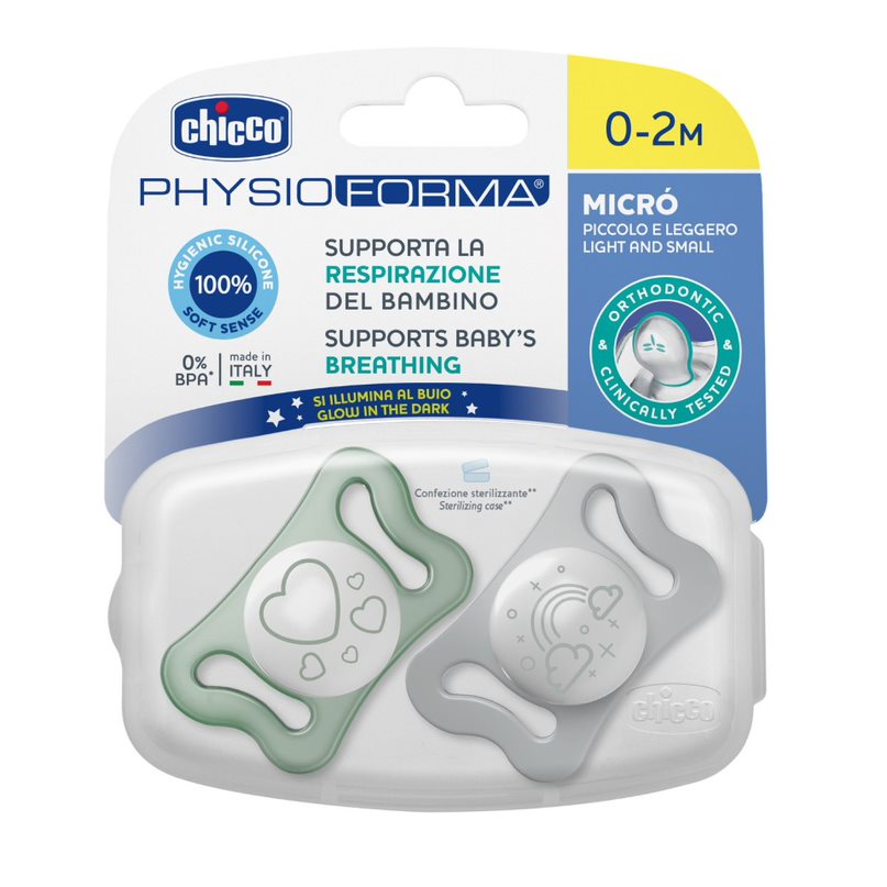 CHICCO 00075126410000 to zestaw dwóch smoczków Physio Micro silikonowych dla noworodków w wieku 0–2 miesięcy. Smoczek został zaprojektowany specjalnie dla noworodków i dzieci o niskiej wadze urodzeniowej, w tym wcześniaków. Jest bardzo lekki (waży tylko 6,4 g), co minimalizuje nacisk na buzię dziecka. Mini końcówka smoczka ma zredukowaną szerokość i długość, aby idealnie dopasować się do ust noworodka. Specjalnie wyprofilowana tarczka zapewnia miejsce dla noska i brody, a otwory wentylacyjne umożliwiają swobodną cyrkulację powietrza. Smoczek pakowany jest podwójnie, dostępny w sześciu dekorach w odcieniach różu i niebieskiego. Po okresie 0–2 miesięcy zaleca się przejście na większe smoczki z linii Physio o identycznym ortodontycznym kształcie.