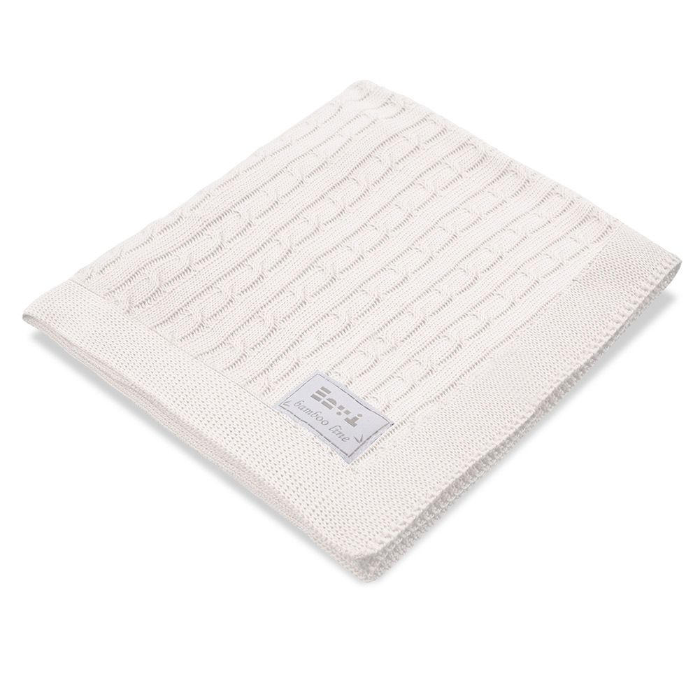 EWA 916679 Kocyk bambusowy ecru warkocz to niemowlęcy kocyk o wymiarach 100 x 75 cm, wykonany w 100% z miękkiej i przyjemnej w dotyku wiskozy bambusowej. Posiada modny wzór w warkocz oraz naszywkę żakardową z logo marki. Nadaje się na każdą porę roku, jest antyalergiczny i delikatny dla wrażliwej skóry dziecka. Produkt w 100% polski.