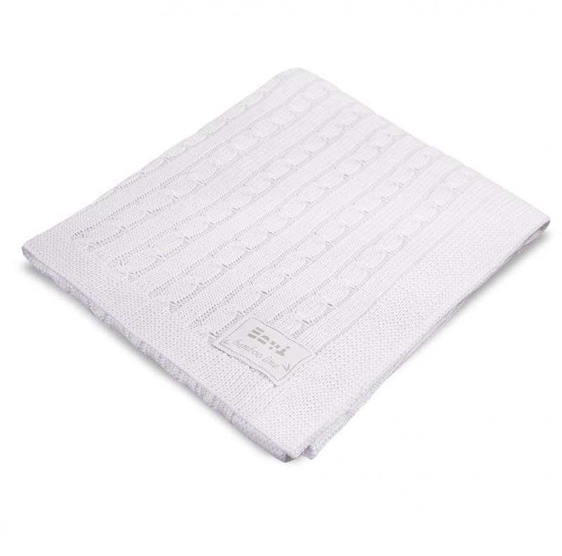 EWA 917225 Kocyk bambusowy biały warkocz to niemowlęcy kocyk o wymiarach 100 x 75 cm, wykonany w 100% z miękkiej i przyjemnej w dotyku wiskozy bambusowej. Posiada modny wzór w warkocz oraz naszywkę żakardową z logo marki. Nadaje się na każdą porę roku, jest antyalergiczny i delikatny dla wrażliwej skóry dziecka.