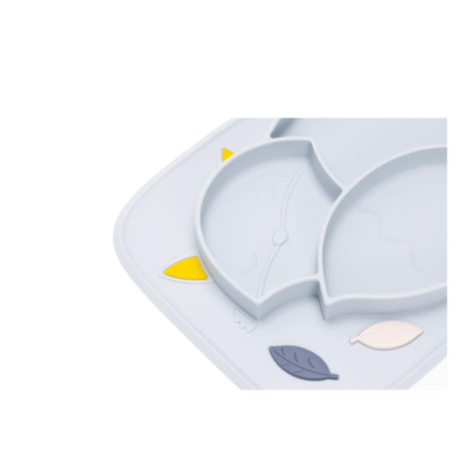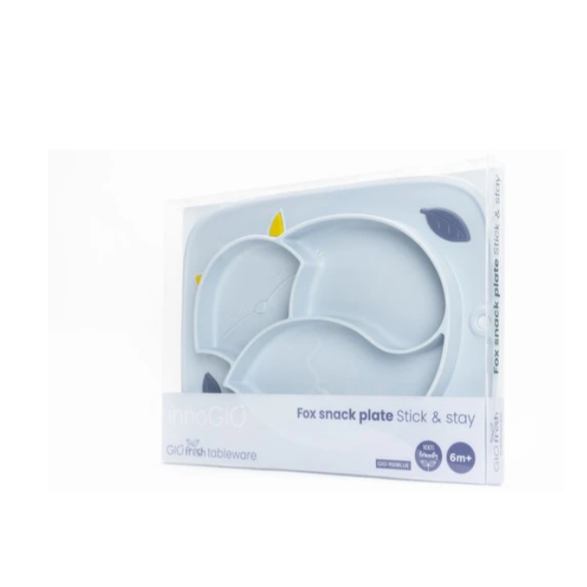 INNOGIO GIO-900 to silikonowy talerzyk Lisek w kolorze niebieskim, przeznaczony dla dzieci od 6. miesiąca życia. Talerzyk posiada trzy przegródki do podawania różnorodnych składników posiłku, zaokrąglone krawędzie ułatwiają nabieranie jedzenia, a antypoślizgowa powierzchnia i silikonowa podstawa zapobiegają przesuwaniu się talerza po blacie. Po zjedzeniu całego posiłku na spodzie talerzyka pojawia się obrazek liska, co motywuje dziecko do jedzenia. Wykonany jest z wysokiej jakości silikonu spożywczego, bezpiecznego, bezzapachowego i wolnego od BPA. Można go myć w zmywarce, używać w kuchence mikrofalowej, piekarniku oraz zamrażarce (-20 °C do 220 °C). Talerzyk jest elastyczny, trwały, odporny na rozbicie, pasuje do większości krzesełek do karmienia. Wymiary talerzyka to 28,6 x 2,5 x 21 cm.