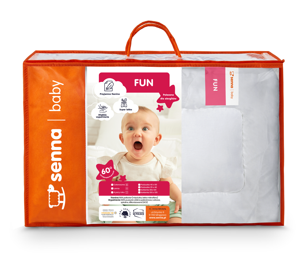 Komplet Senna Baby Fun to miękki i funkcjonalny zestaw składający się z kołderki i poduszki dla dzieci. Produkt jest bezpieczny dla alergików.
