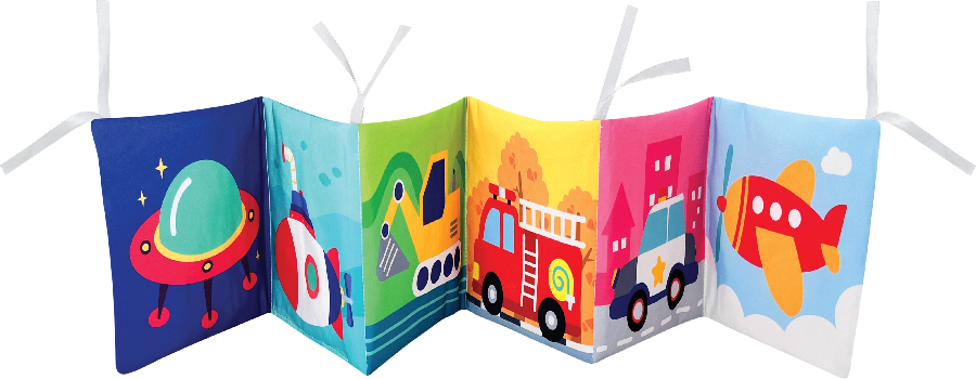 Strony książeczki wykonane zostały z szeleszczącego materiału, który stymuluje zarówno zmysł dotyku, jak i słuchu dziecka. Książeczka posiada praktyczne troczki, umożliwiające przywiązanie jej do łóżeczka lub wózka, dzięki czemu maluszek może bezpiecznie odkrywać kolejne strony.