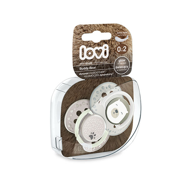 Smoczek silikonowy dynamiczny LOVI 22/862 dla dzieci 0–2 miesięcy Buddy Bear został opracowany przy udziale lekarzy i neurologopedów. Ma symetryczny kształt inspirowany brodawką sutkową, a zastosowanie niejednorodnej warstwy silikonu pozwala dziecku ssać w indywidualnym rytmie. W zestawie znajdują się 2 smoczki LOVI, 2 osłonki oraz kapsuła do higienicznego przechowywania smoczków.