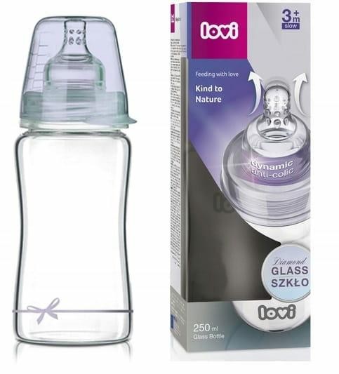 Szklana butelka LOVI Diamond Glass 250 ml Baby Shower Boy to bezpieczne i wygodne rozwiązanie do karmienia niemowląt, które nie zaburza naturalnego odruchu ssania. Wyposażona w dynamiczny smoczek z niejednorodnych warstw silikonu wspiera prawidłowy rytm ssania oraz aktywną pracę mięśni warg i języka.