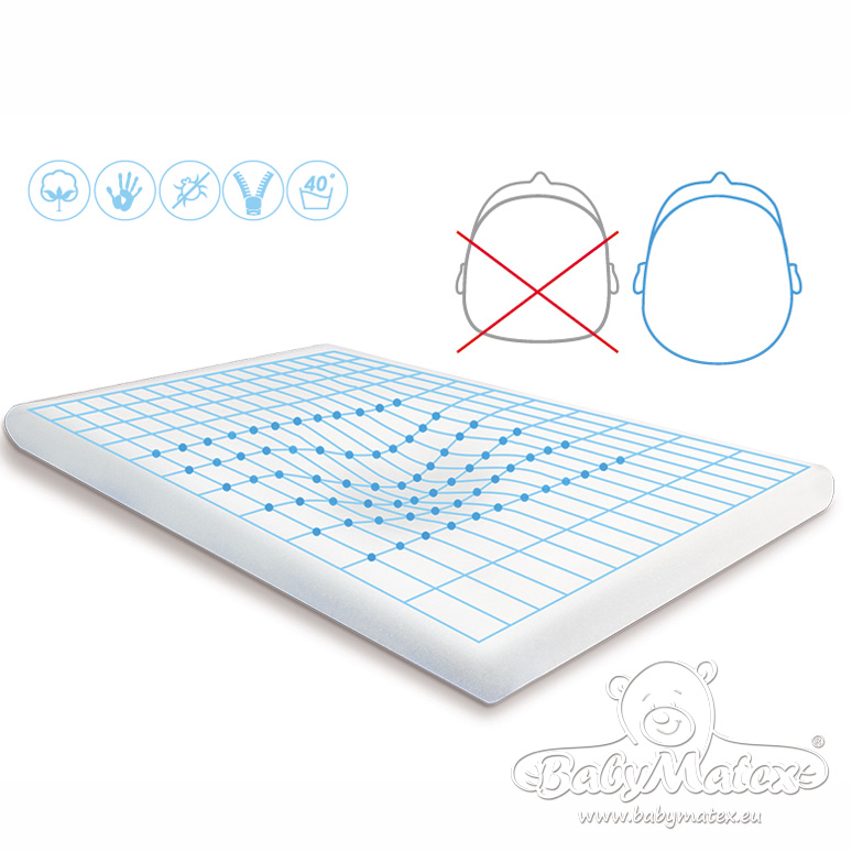 Poduszka termoplastyczna MEMO została stworzona z myślą o delikatnej główce niemowlęcia. Wykonana z pianki z pamięcią kształtu (memory foam), która pod wpływem nacisku i ciepła ciała dopasowuje się do kształtu główki dziecka, a po zmianie pozycji przez kilka sekund zachowuje profil odciśniętej formy. Zapewnia miękkość podczas snu, zmniejsza ryzyko odgnieceń i deformacji czaszki. Poszewka z antyalergicznej dzianiny żakardowej zapewnia prawidłową cyrkulację powietrza i jest zapinana na bezpieczny zamek.