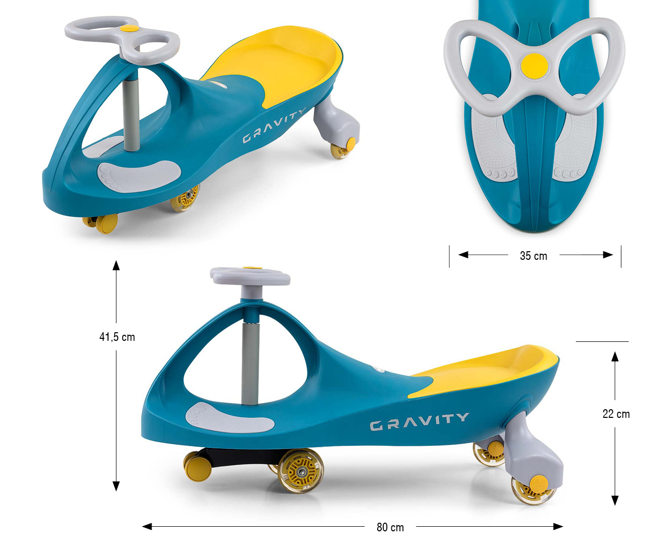 MILLY MALLY Jeździk Grawitacyjny Gravity Green Yellow to innowacyjny pojazd dla dzieci od 3 roku życia, który nie wymaga pedałów ani baterii – porusza się dzięki sile grawitacji i ruchom ciała dziecka. Dziecko steruje jeździkiem, manewrując kierownicą w prawo i w lewo, co wspiera rozwój motoryki, koordynacji i kondycji fizycznej. Jeździk ma świecące kółka LED, wyprofilowane i wygodne siedzisko oraz stabilną, szeroką podstawę z nisko położonym środkiem ciężkości, co zapewnia bezpieczeństwo podczas zabawy. Solidna konstrukcja z wysokiej jakości tworzywa oraz piankowa osłona kolumny kierowniczej dodatkowo chronią dziecko, a ergonomiczna kierownica jest łatwa do uchwycenia przez małe rączki. Maksymalne obciążenie pojazdu wynosi 50 kg, a produkt spełnia europejskie normy bezpieczeństwa. Wymiary jeździka to 41,5 cm wysokości, 80 cm długości i 35 cm szerokości, wysokość do siedziska wynosi 22 cm, szerokość siedziska 26 cm, długość siedziska 20 cm, szerokość kierownicy 25 cm, a średnica kół to 9 cm. Pojazd rozwija równowagę i koordynację ruchową, zachęca do aktywności fizycznej, ćwiczy motorykę dużą i zapewnia bezpieczną oraz emocjonującą zabawę zarówno w domu, jak i na świeżym powietrzu.