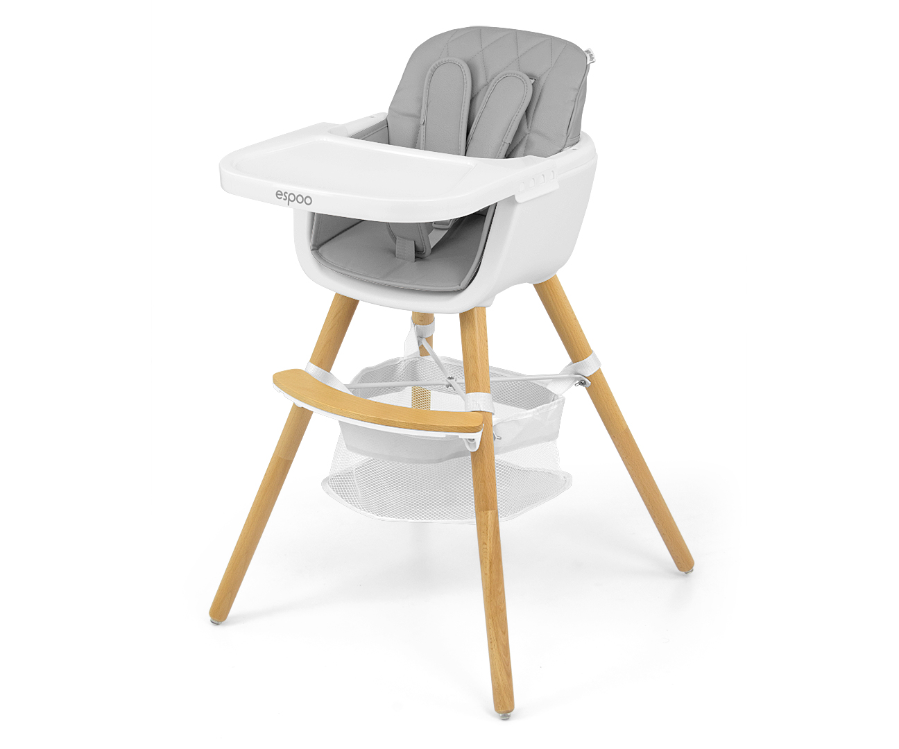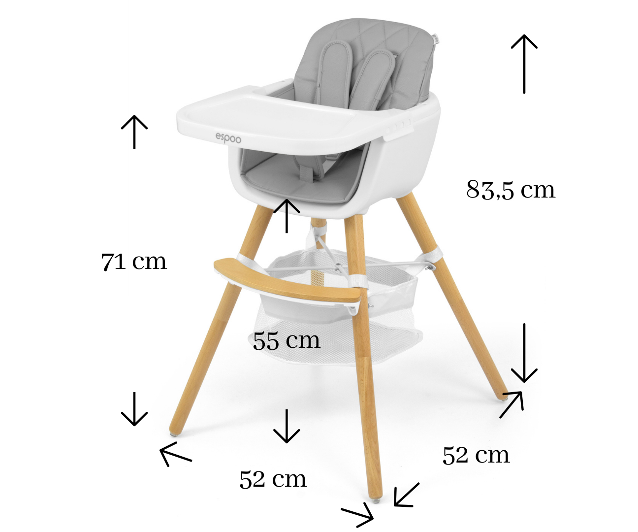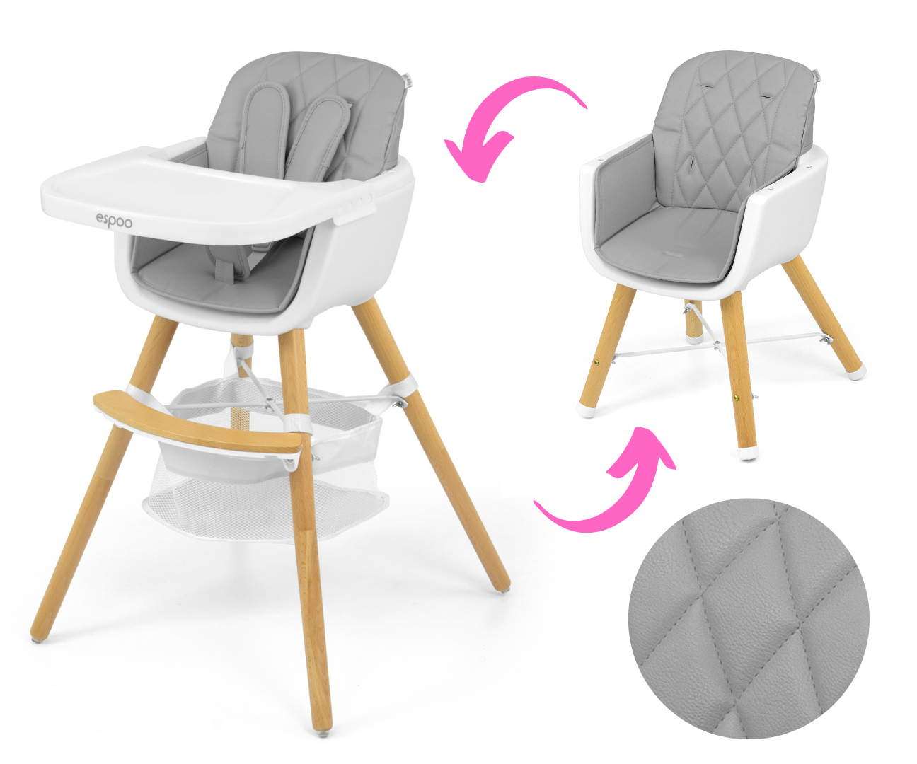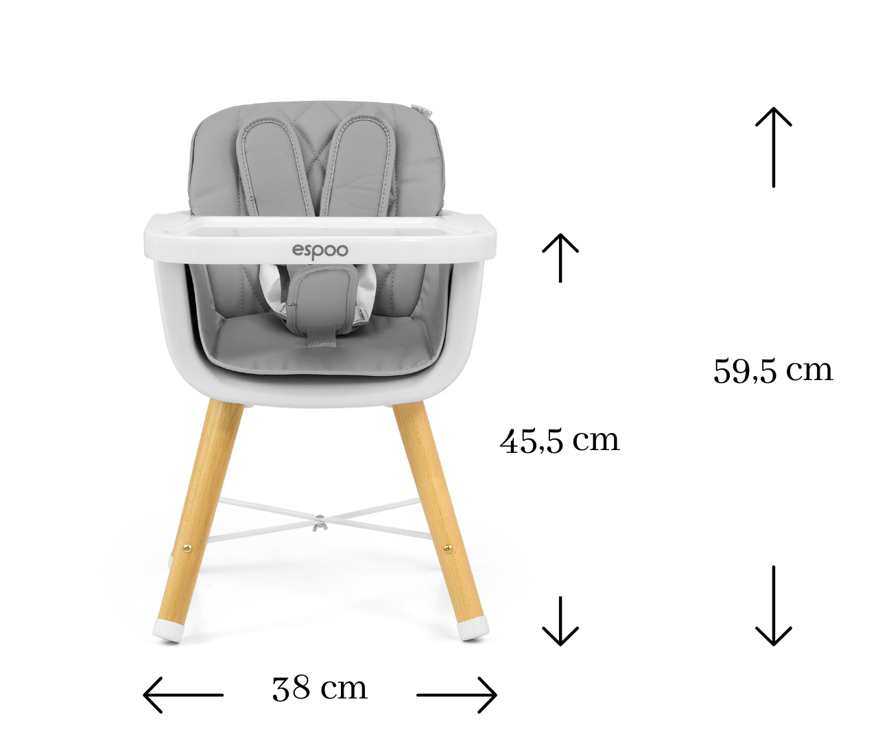 Milly Mally Espoo Grey to nowoczesne krzesełko do karmienia 2w1 zaprojektowane z myślą o rodzicach ceniących funkcjonalność, minimalizm i bezpieczeństwo. Model ten łączy w sobie aż cztery możliwości użytkowania, dzięki czemu może pełnić funkcję wysokiego lub niskiego krzesełka do karmienia, a z czasem stać się pierwszym samodzielnym krzesełkiem dla dziecka dosuwanym do stolika. Przeznaczone jest dla dzieci od 6. miesiąca życia do około 5 lat lub do osiągnięcia maksymalnej wagi 15 kg.