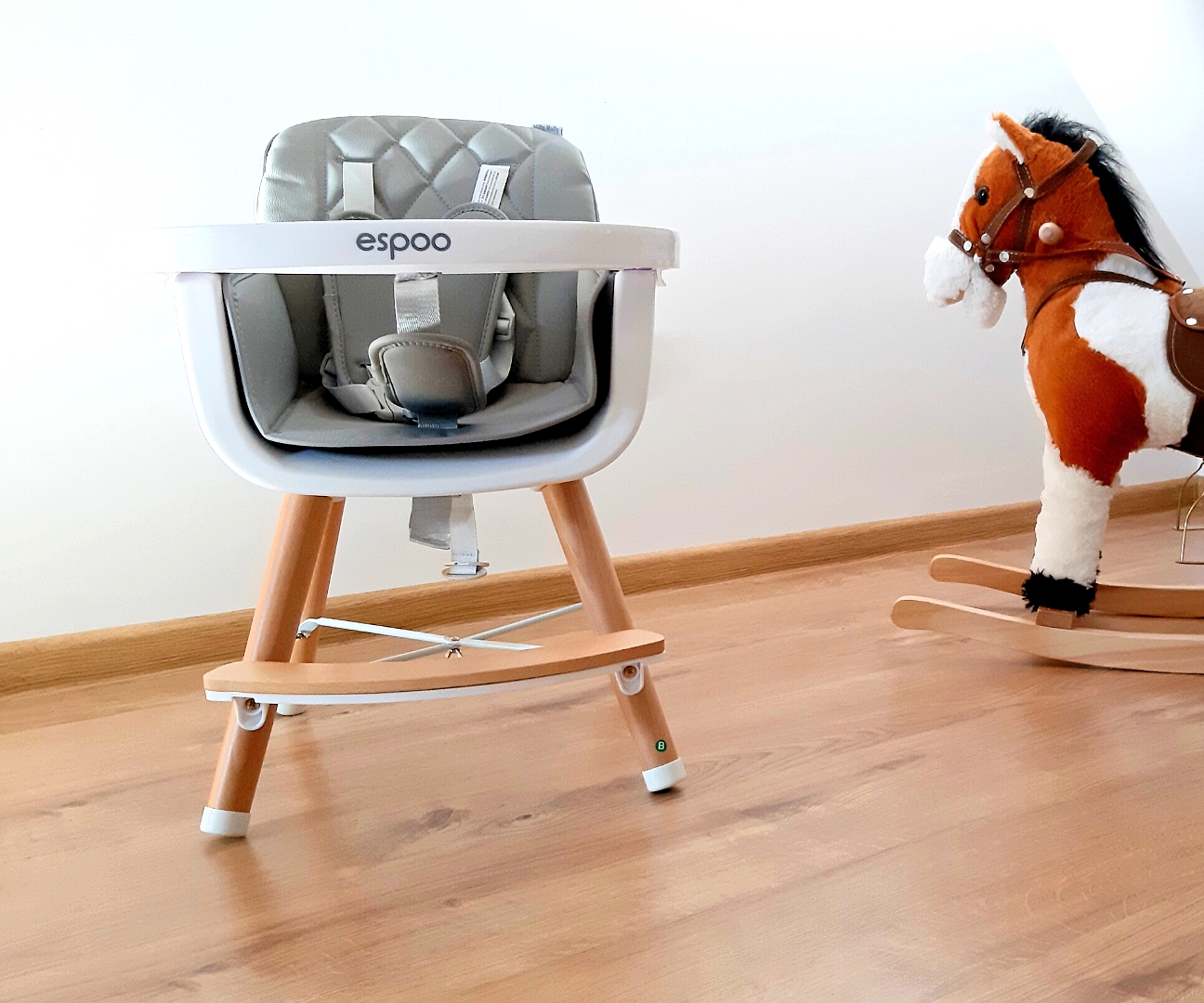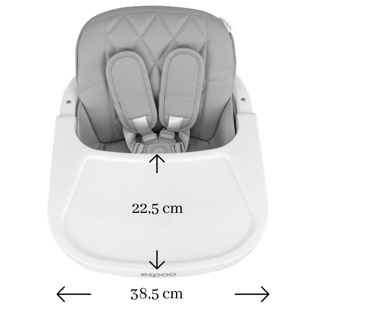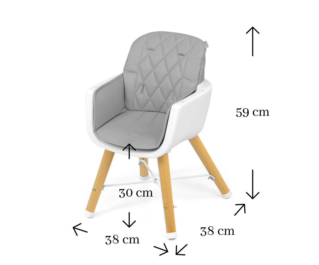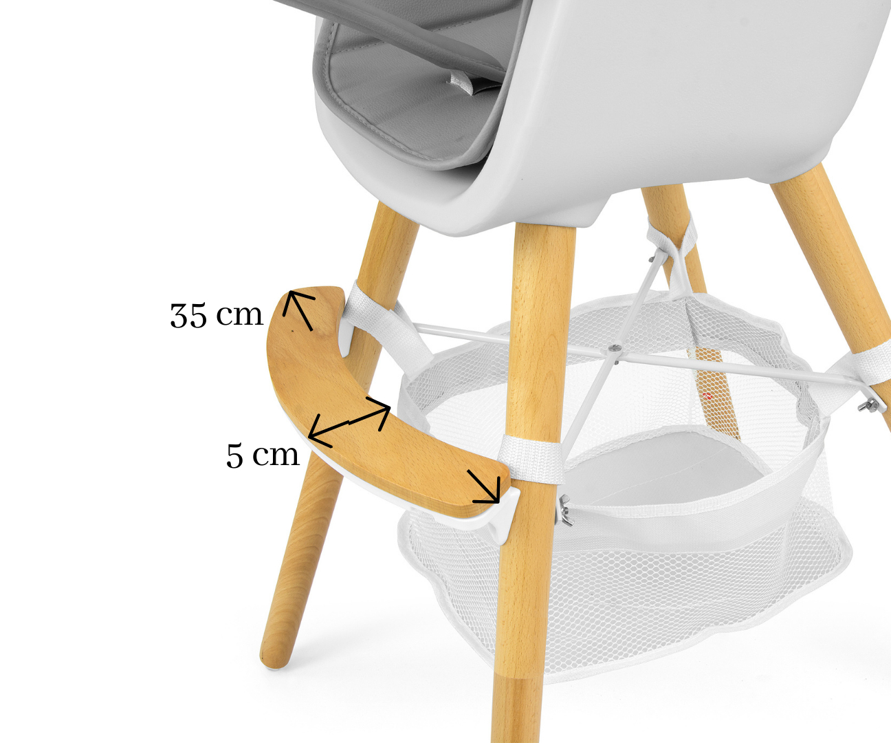 Obszerne, ergonomicznie wyprofilowane siedzisko zostało wyposażone w miękką tapicerkę z ekoskóry, odporną na zabrudzenia i bardzo łatwą w czyszczeniu. Zdejmowana tacka z praktycznym wgłębieniem zapobiega zsuwaniu się naczyń i zabawek, a jej gładka powierzchnia umożliwia szybkie utrzymanie higieny. Drewniany podnóżek poprawia komfort i sprzyja prawidłowej pozycji dziecka podczas posiłków. Dodatkowym udogodnieniem jest praktyczny koszyk pod siedziskiem, idealny na drobne akcesoria.