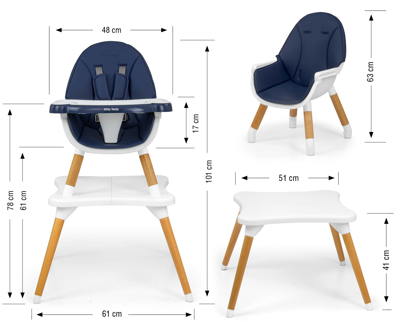 Milly Mally Malmo Navy to nowoczesne krzesełko do karmienia 2w1, które łączy funkcjonalność, bezpieczeństwo i minimalistyczny design. Model został zaprojektowany z myślą o dzieciach i rodzicach ceniących praktyczne rozwiązania oraz estetykę pasującą do współczesnych wnętrz. Granatowa kolorystyka Navy nadaje krzesełku elegancki, ponadczasowy charakter, który dobrze komponuje się zarówno w kuchni, jak i jadalni.