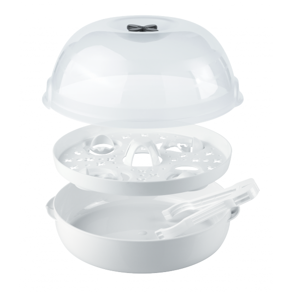 NUK 256444 Micro Express Plus to mikrofalowy sterylizator przeznaczony do codziennej dezynfekcji akcesoriów niemowlęcych, które mogą być używane w kuchence mikrofalowej. Sterylizuje do 4 butelek wraz z akcesoriami w zaledwie 4 minuty. Jest odpowiedni dla wszystkich butelek NUK, z wyjątkiem butelek wykonanych z PA. W zestawie znajdują się szczypce do bezpiecznego wyjmowania wysterylizowanych elementów. Należy zwrócić uwagę na minimalne wymiary wewnętrzne mikrofalówki.