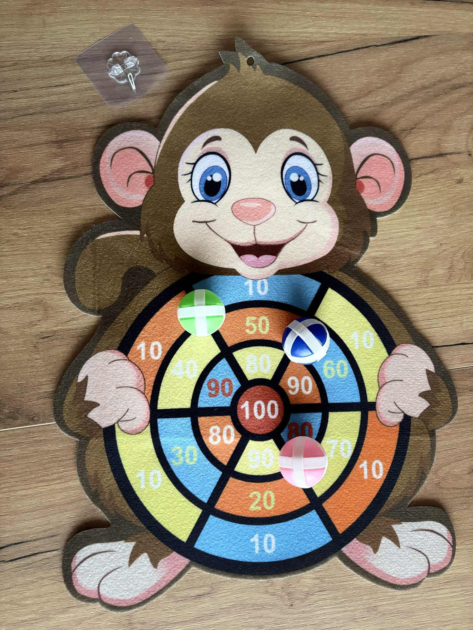 Zamień każdy pokój w pole do zabawy! Kolorowa tarcza na rzepy w kształcie małpki to fantastyczny sposób na aktywną, bezpieczną i rozwijającą rozrywkę dla dzieci w każdym wieku. Zamiast ostrych grotów – miękkie piłeczki na rzepy, które zawsze bezpiecznie przylegają do tarczy.