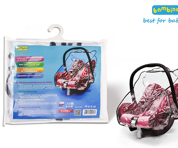 Pokrowiec foliowy TopGal 210323 na fotelik samochodowy chroni dziecko przed deszczem i śniegiem, zapewniając suchą i komfortową podróż w trudnych warunkach atmosferycznych.