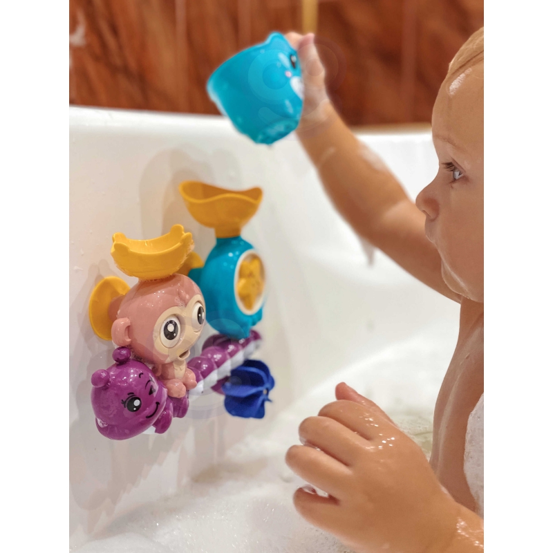 Zabawka wodna WOOPI E46699 Małpka z kubkiem to interaktywna zabawka do kąpieli dla dzieci od 18 miesiąca życia. Dziecko wlewa wodę do czapki małpki za pomocą dołączonego kubeczka, co powoduje kręcenie się oczu małpki, otwieranie buzi i wlewanie wody do wanny. Dodatkowo gąsienica i gwiazdka w zestawie wlewają wodę na kołowrotek, który się obraca. Zabawka posiada dwie przyssawki umożliwiające przymocowanie jej do ściany lub wanny. Pomaga rozwijać zdolności manualne, wyobraźnię i świadomość otoczenia, a także angażuje dziecko podczas kąpieli.
