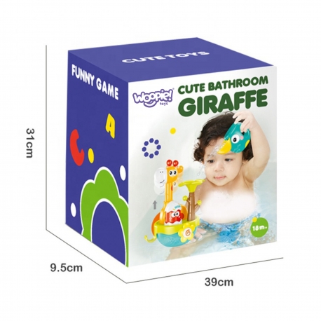 Zabawka do kąpieli WOOPIE 54726 Żyrafka to interaktywna zabawka dla dzieci od 18 miesiąca życia, która pomaga oswoić malucha z wodą. Żyrafka mocuje się do wanny przyssawką, a w zestawie znajduje się lejek w kształcie kaczuszki, którym dziecko napełnia zbiornik zabawki. Po wlaniu wody uruchamia się efekt wodospadu, a z czerwonej postaci wysuwa się głowa, co dodatkowo bawi dziecko. Zabawka posiada wbudowany haczyk do łatwego przechowywania i nadaje się do zabawy zarówno w łazience, jak i na zewnątrz.