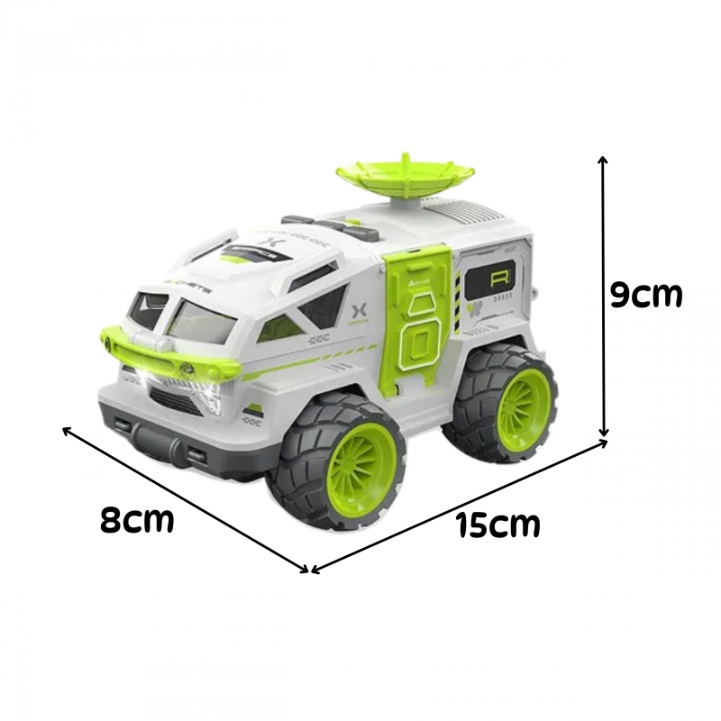 Zabawka wykonana jest z trwałego tworzywa ABS, posiada szerokie, gumowane koła o terenowym bieżniku, zapewniające stabilność i możliwość zabawy na różnych powierzchniach. Satelita wspiera rozwój wyobraźni przestrzennej, kreatywności, zdolności manualnych, logicznego myślenia oraz kompetencji społecznych w zabawie z innymi dziećmi. Produkt zasilany jest bateriami 3x LR44 (w zestawie) i wyróżnia się nowoczesnym designem w neonowych kolorach, przyciągającym wzrok malucha. Wymiary pojazdu to 15 x 8 x 9 cm.