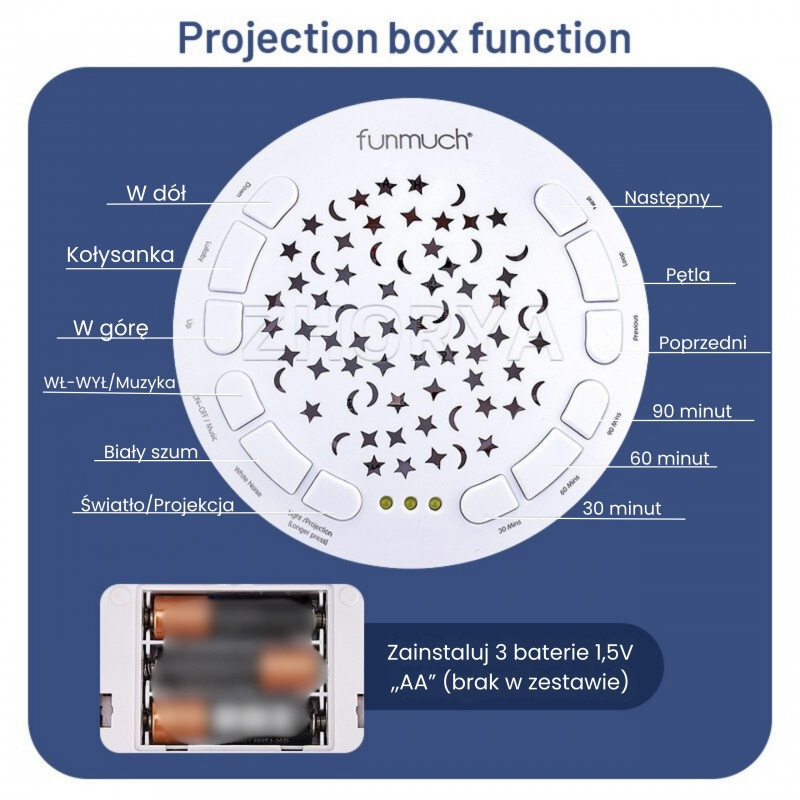 Zasilanie: 3 × AA 1,5V (brak w zestawie)
