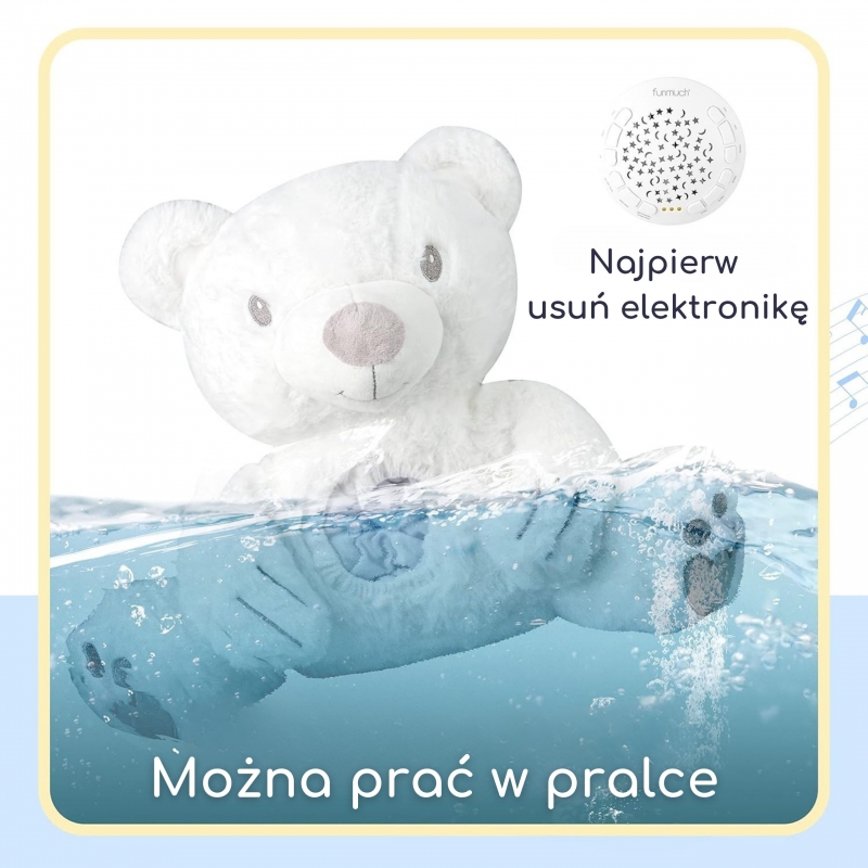 Mięciutki Miś Polarny z projektorem od marki Woopie to idealny towarzysz snu dla najmłodszych. Wykonana z bezpiecznej, miękkiej bawełnianej tkaniny przytulanka łączy funkcję uspokajacza z muzyką i projektora świetlnego, tworząc na suficie gwieździste niebo z księżycami w różnych efektach świetlnych. Wbudowana klasyczna nakręcana pozytywka wydaje przyjemną melodyjkę, dodatkowo wspierając relaks i wyciszenie malucha przed snem. Miś jest łatwy w utrzymaniu czystości – po wyjęciu modułu elektronicznego można go prać w pralce.