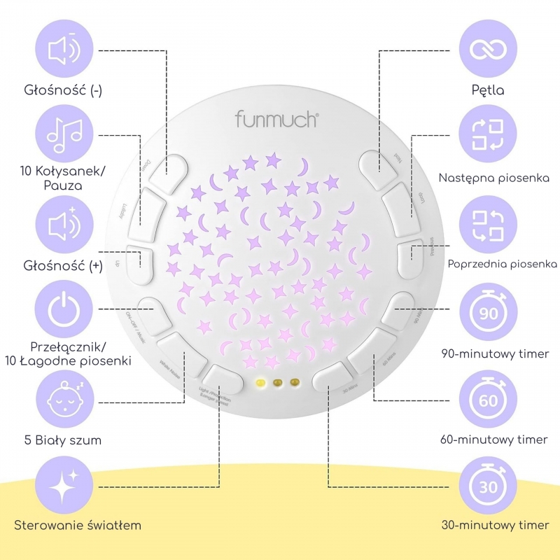 Przytulanka wspiera rozwój sensoryczny dziecka, pobudzając zmysł wzroku poprzez kolorowe światła projekcji oraz zmysł słuchu dzięki uspokajającym melodiom i delikatnym szumom. Zapewnia poczucie bezpieczeństwa i komfortu, ułatwiając zasypianie i wspierając spokojny sen malucha.
